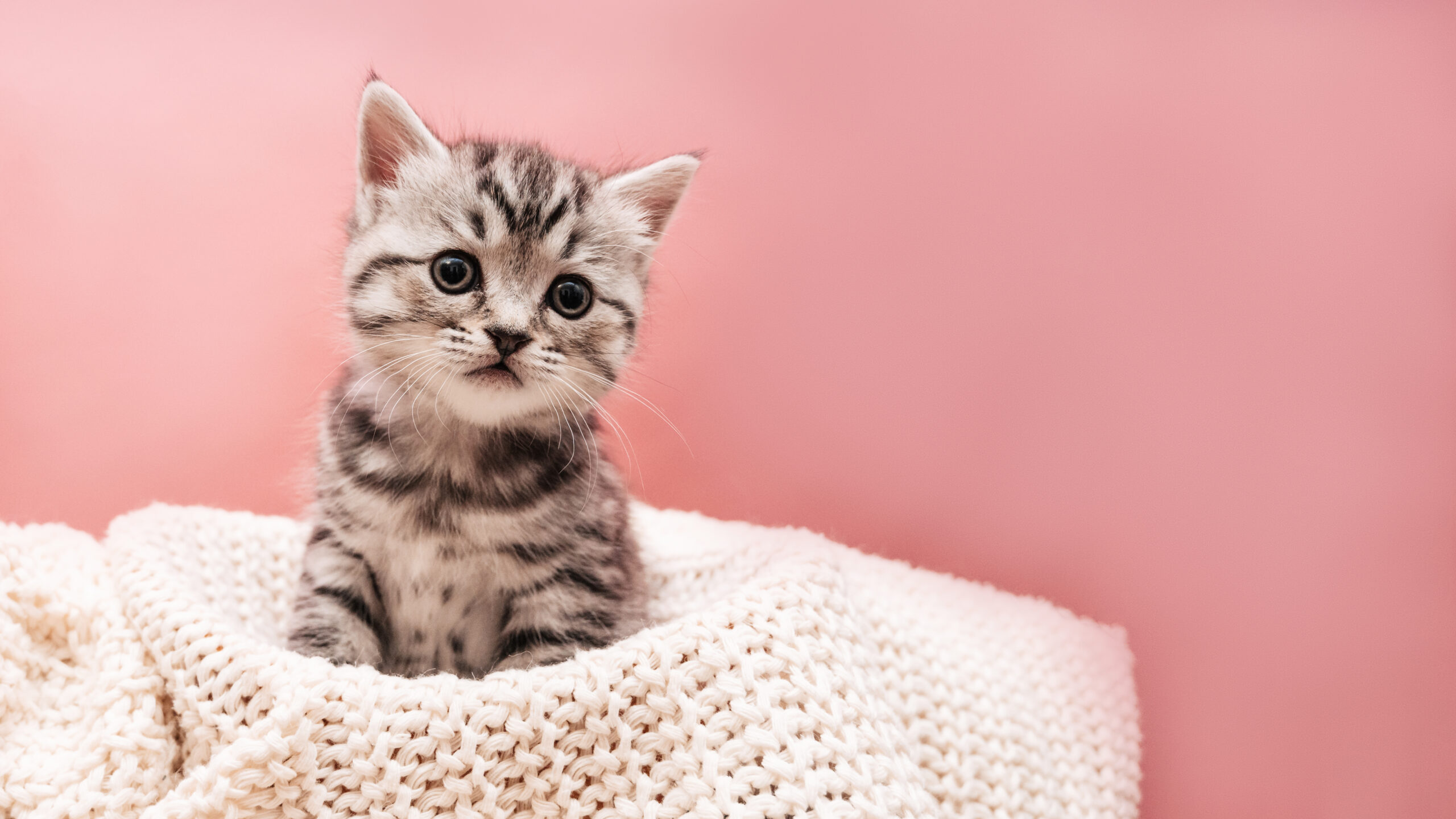 Portrait of a cute fluffy striped kitten on a light pink background with a place for your text.